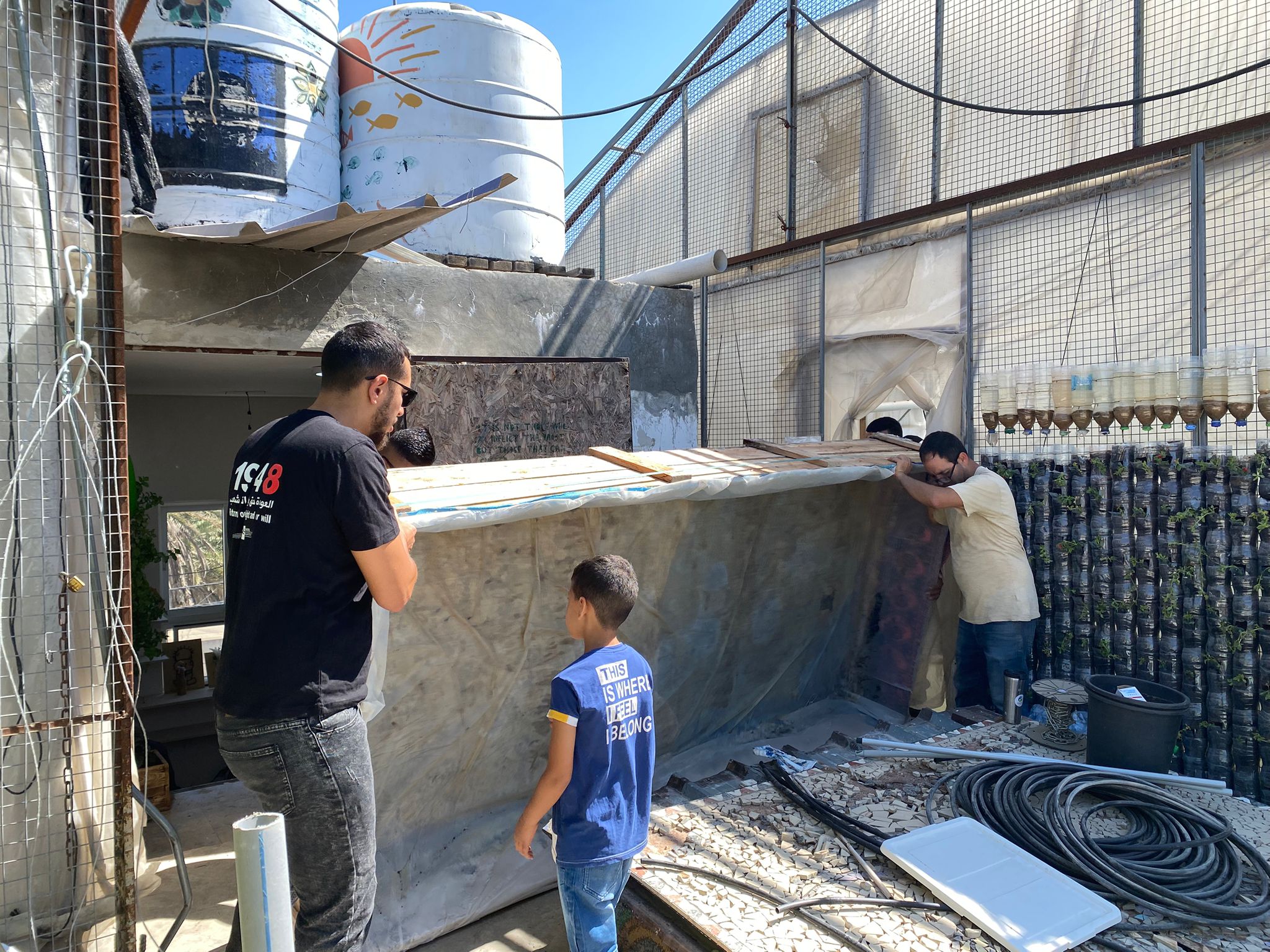 On the environmental side, significant work was carried out to maintain and improve the center’s green spaces. The first greenhouse was cleared of old hydroponic systems and prepared for new Dutch Bucket installations, including floor coating and table measurements. Plants on the rooftop, in the stairwell, and throughout the center were regularly cared for, while tomato plants in the second greenhouse were tied and fertilized with iron. Regular inspections ensured water supply and optimal plant growth. The Environmental Club also conducted weekly activities focused on recycling plastic bottles into decorative flowers.